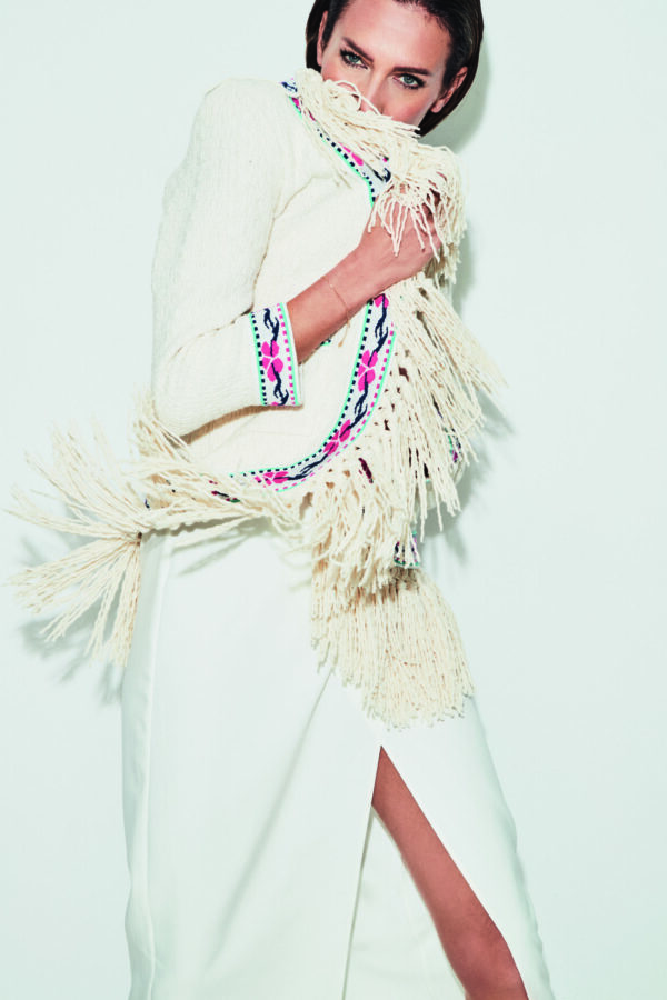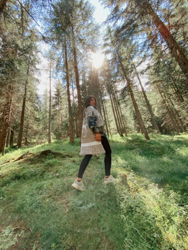 Fatta di due materiali: il petto in camoscio e le maniche e la schiena in cotone jeans blu scuro