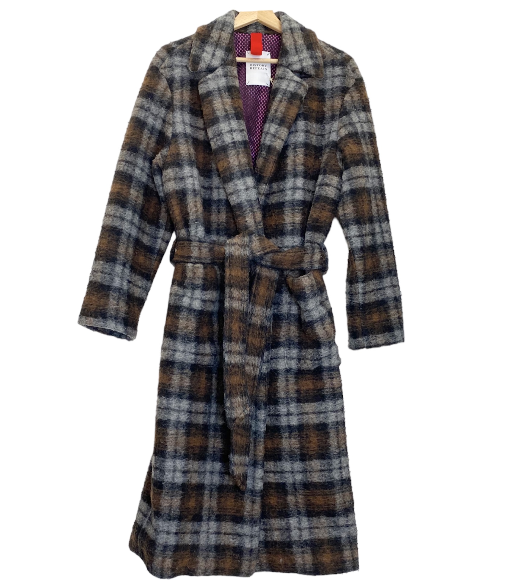 Il cappotto lungo di History Repeats ĆØ fatto in tessuto casentino con trama check marrone e grigio