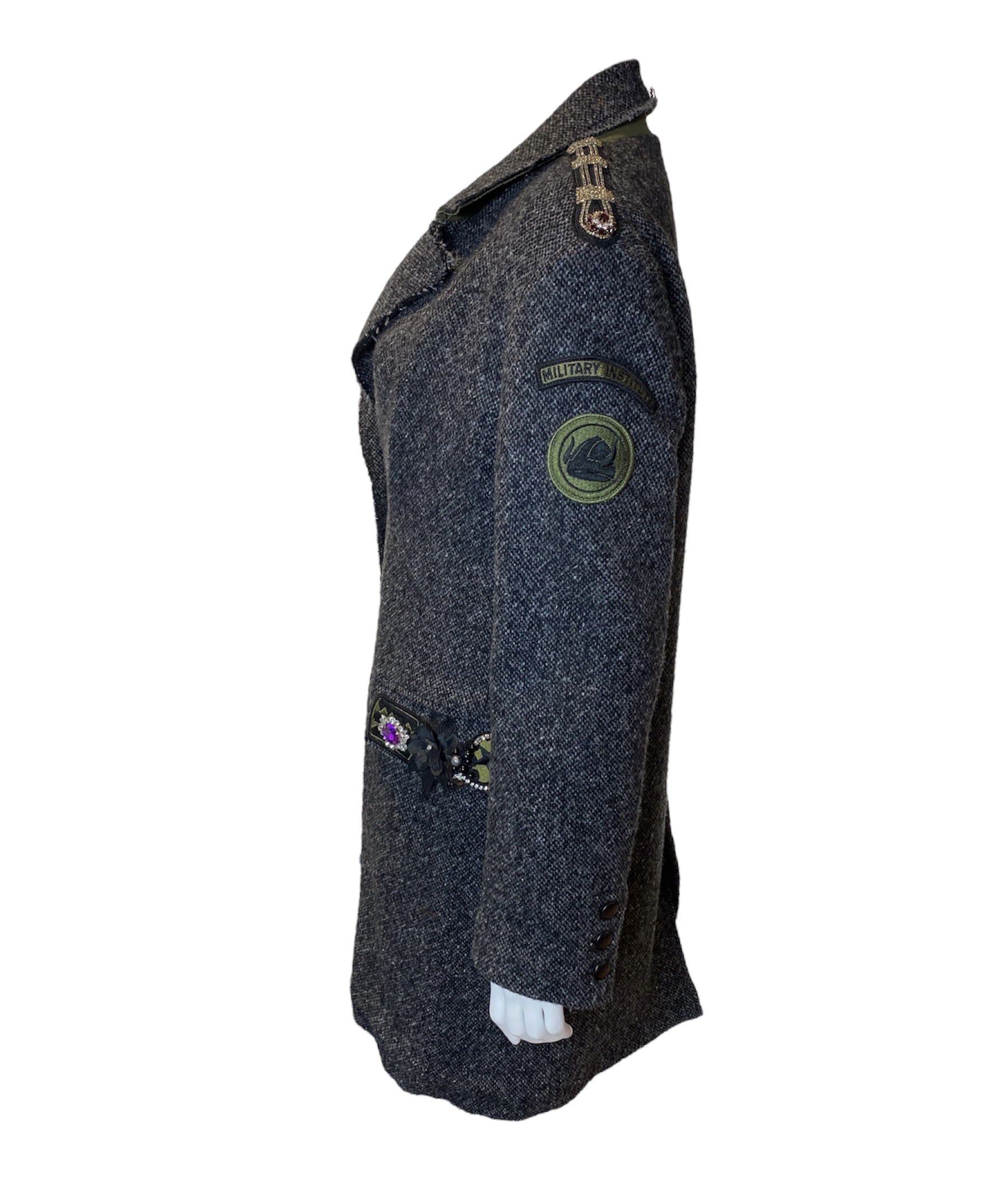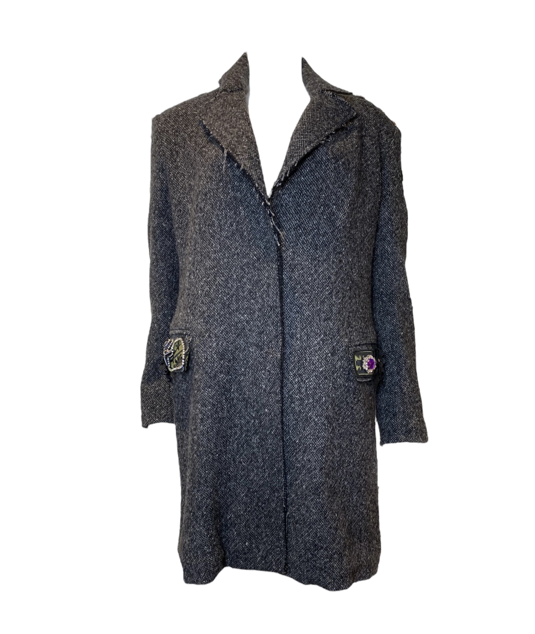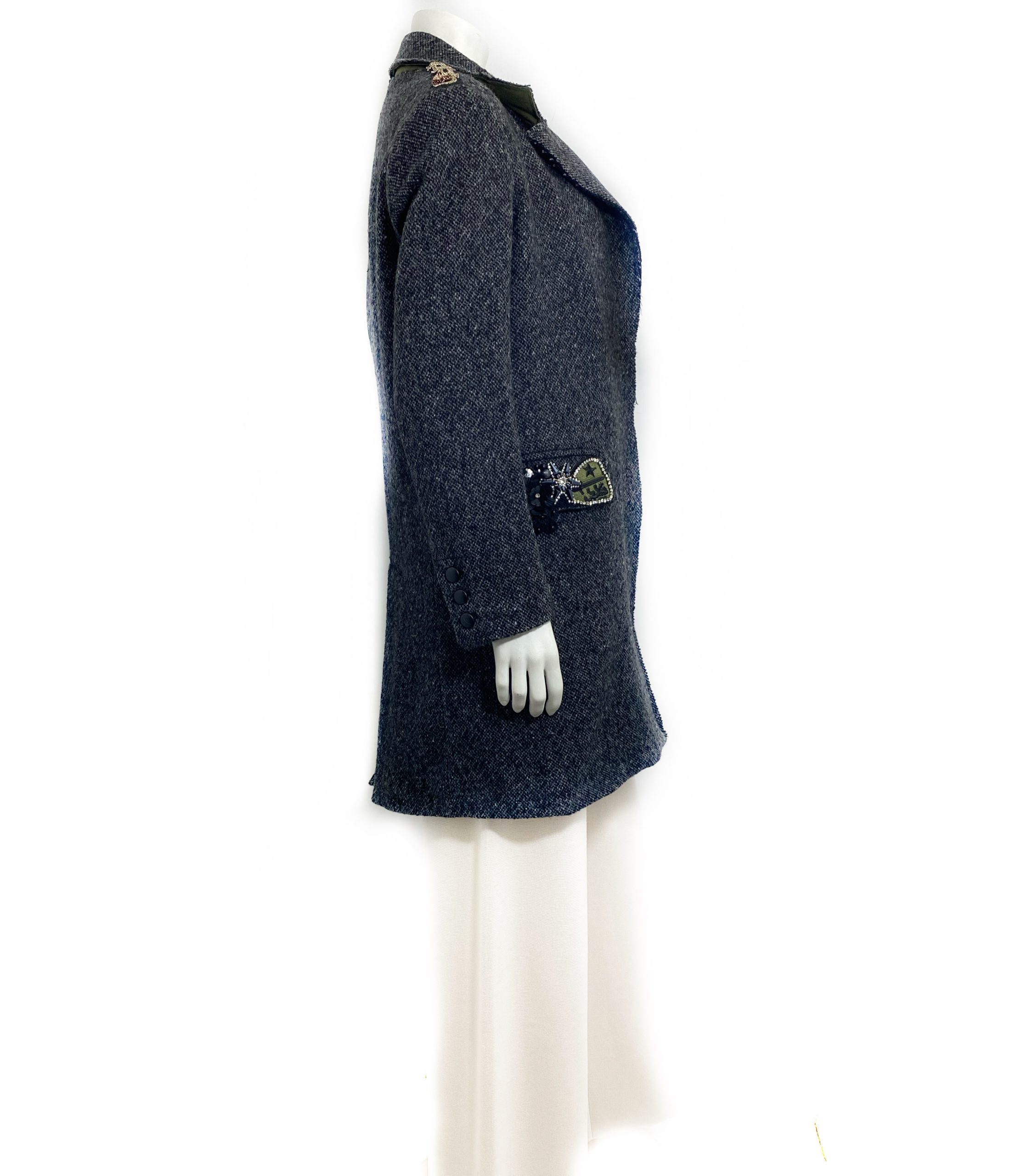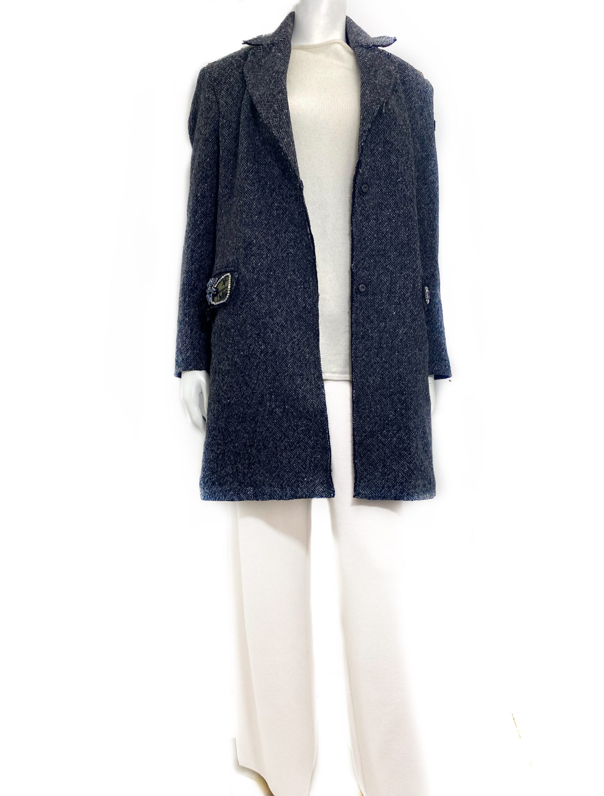 Il cappotto sale e pepe di History Repeats presenta una sofisticata combinazione di tonalitĆ grigie, creando un effetto visivo raffinato e versatile. Le decorazioni gioiello posizionate sulle spalle e sulla chiusura delle tasche aggiungono un tocco di lusso e glamour al capo, catturando l’attenzione con la loro brillantezza sottile.