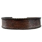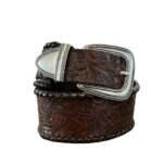 Realizzata a mano con cura e maestria in Italia, questa cintura è un capolavoro artigianale. È realizzata in pregiata pelle marrone incisa con un delicato decoro floreale, che aggiunge un tocco di raffinatezza a qualsiasi outfit.