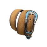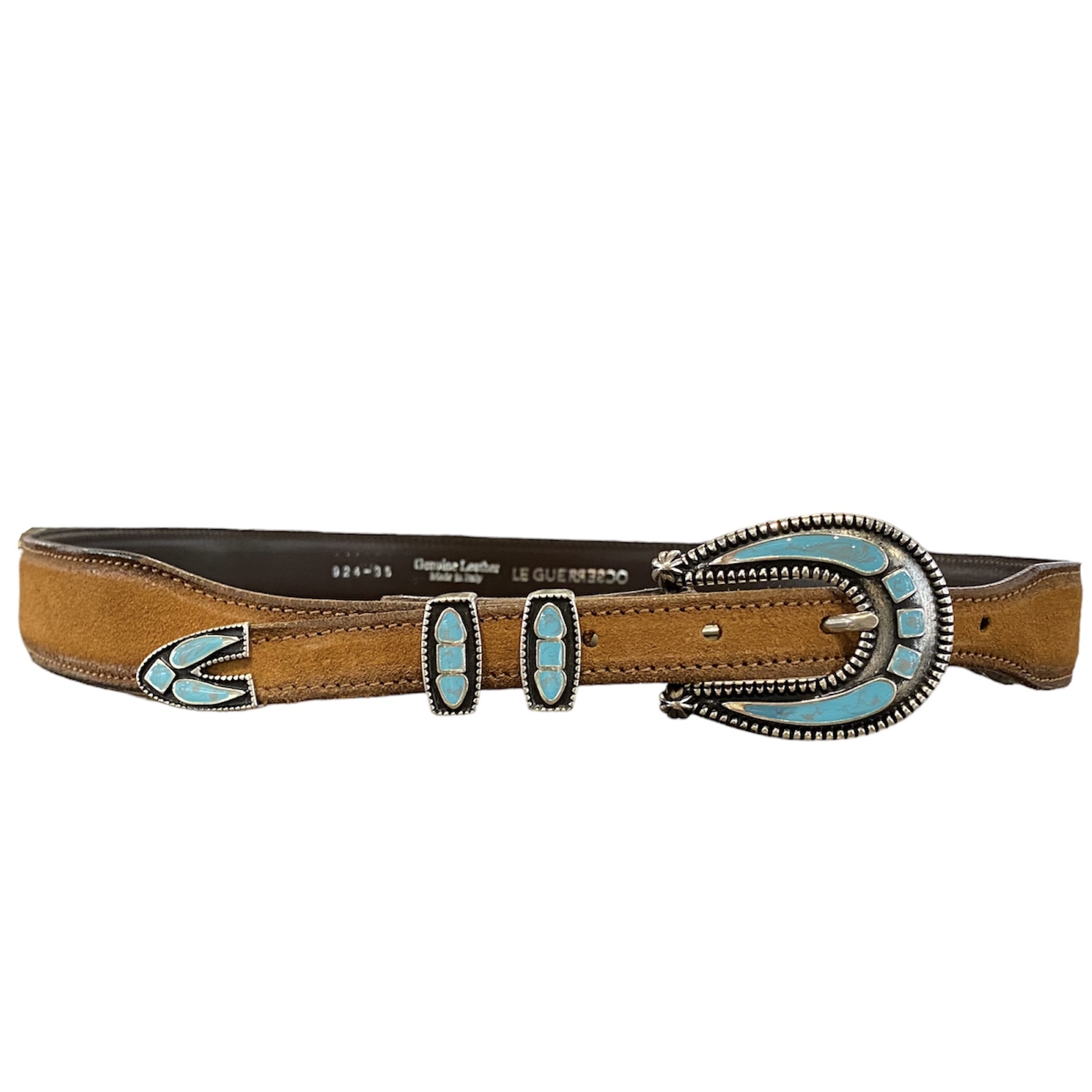 Introduciamo la nostra splendida cintura in camoscio color cuoio con fibbia turchese di Le Guerresco, un gioiello artigianale made in Italy che aggiunge un tocco di stile unico ai tuoi outfit.