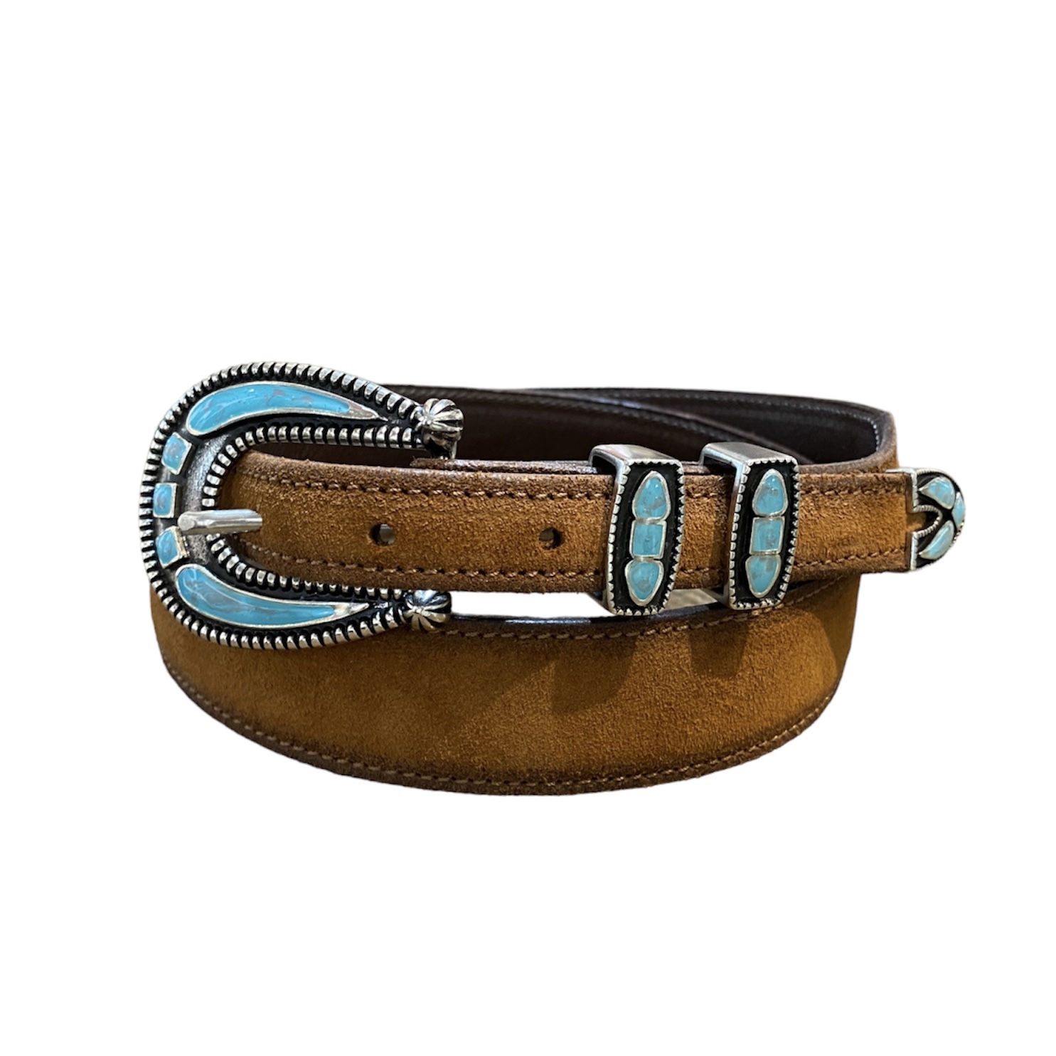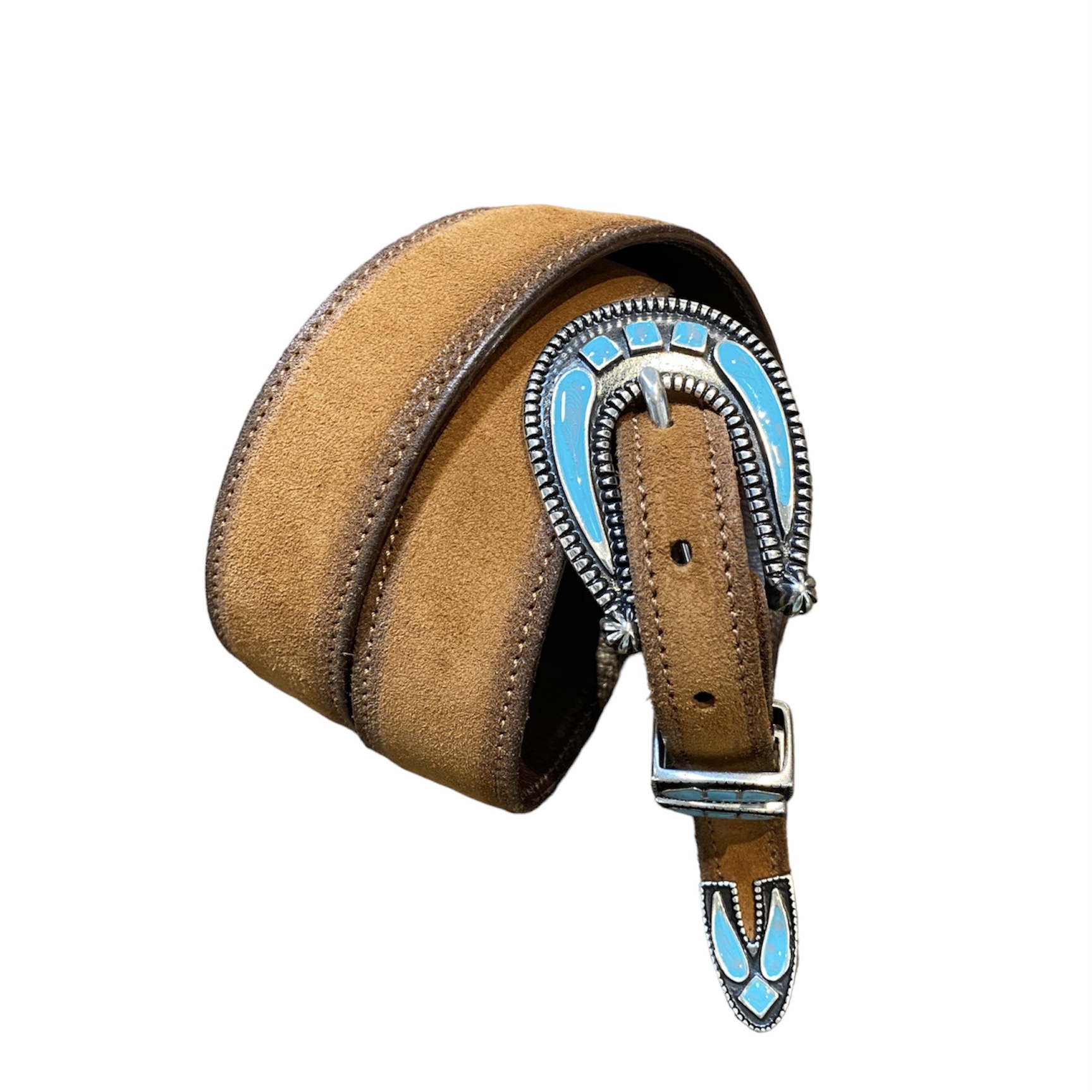 Non rinunciare a uno stile impeccabile e alla qualitĆ  artigianale italiana. Aggiungi subito la nostra cintura in camoscio color cuoio con fibbia turchese al tuo carrello e fai risplendere il tuo look in modo unico e raffinato.