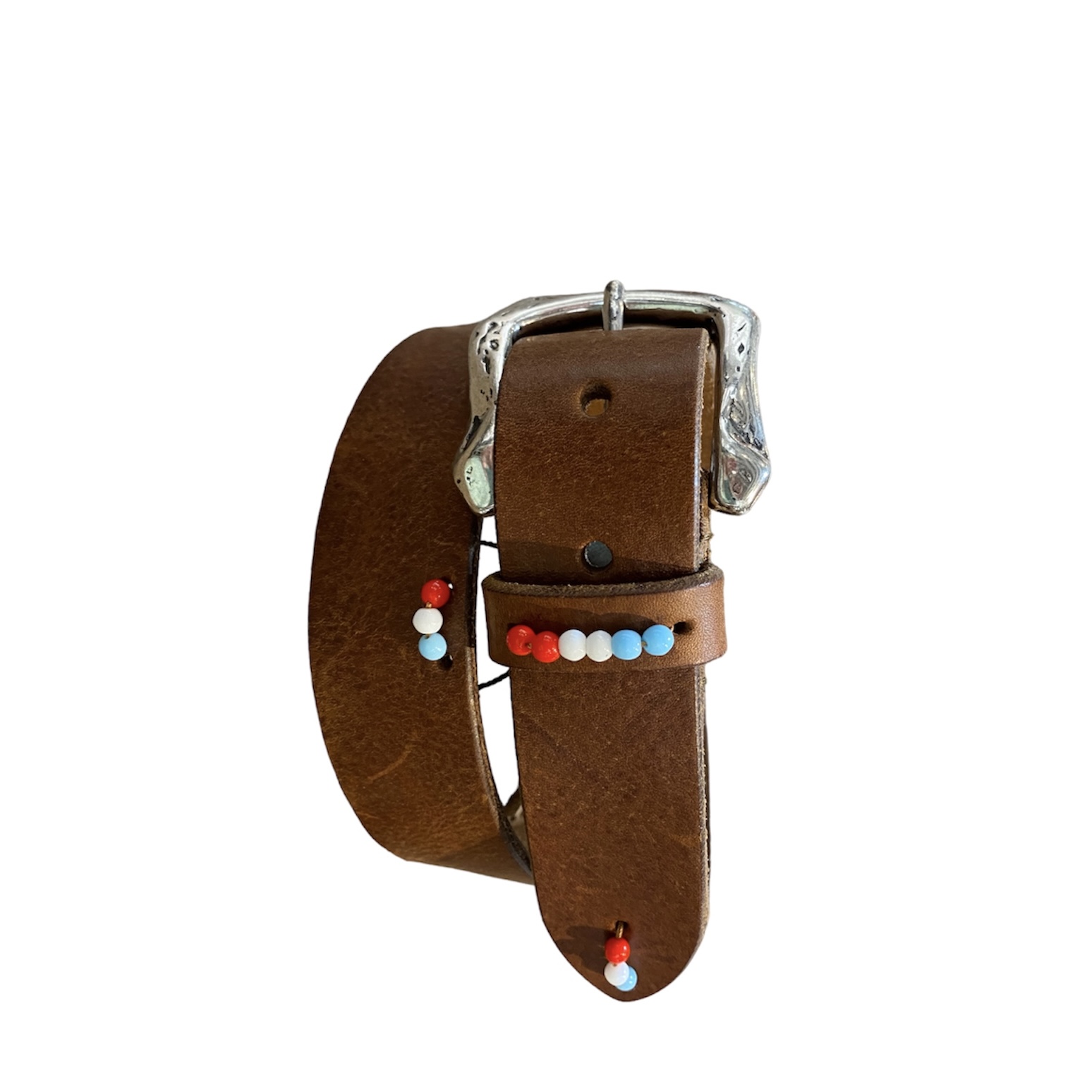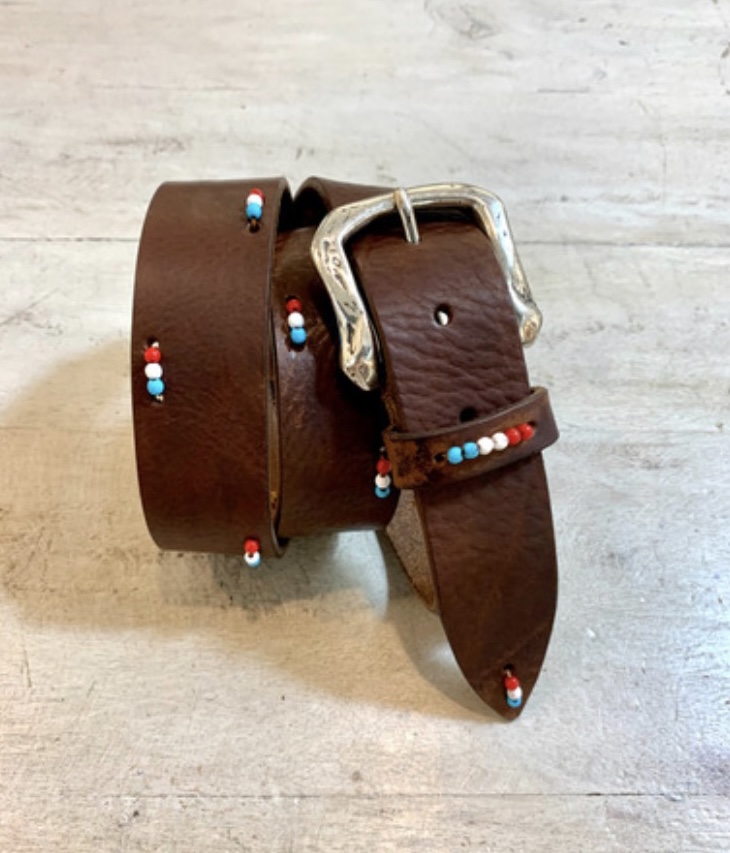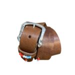 Scegli la qualitĆ  artigianale e lo stile italiano con la cintura di Le Guerresco. Con il suo cuoio bruciato pregiato, le perline colorate e la fibbia a forma di ferro di cavallo, questa cintura ti farĆ  risaltare con un tocco di classe e originalitĆ . Aggiungila al tuo guardaroba oggi stesso e preparati a distinguerti con il tuo gusto impeccabile.