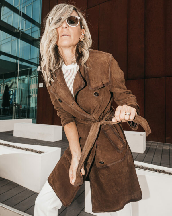 Il nostro trench in camoscio invecchiato marrone è il capo che non può mancare nel tuo guardaroba. Con cintura in