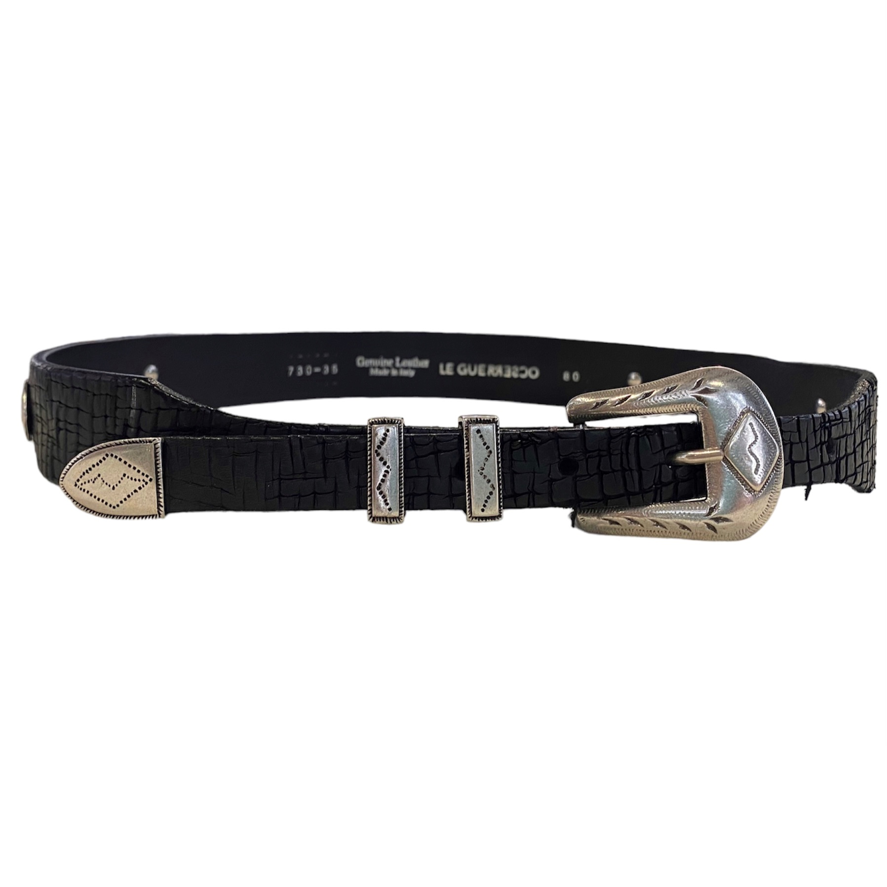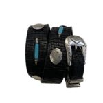 Realizzata a mano in Italia, questa cintura presenta un raffinato effetto squame sulla pelle lavorata, che aggiunge un tocco di originalitĆ e sofisticazione al vostro look. Le borchie argentate decorate con turchesi creano un’armoniosa combinazione di elementi distintivi.