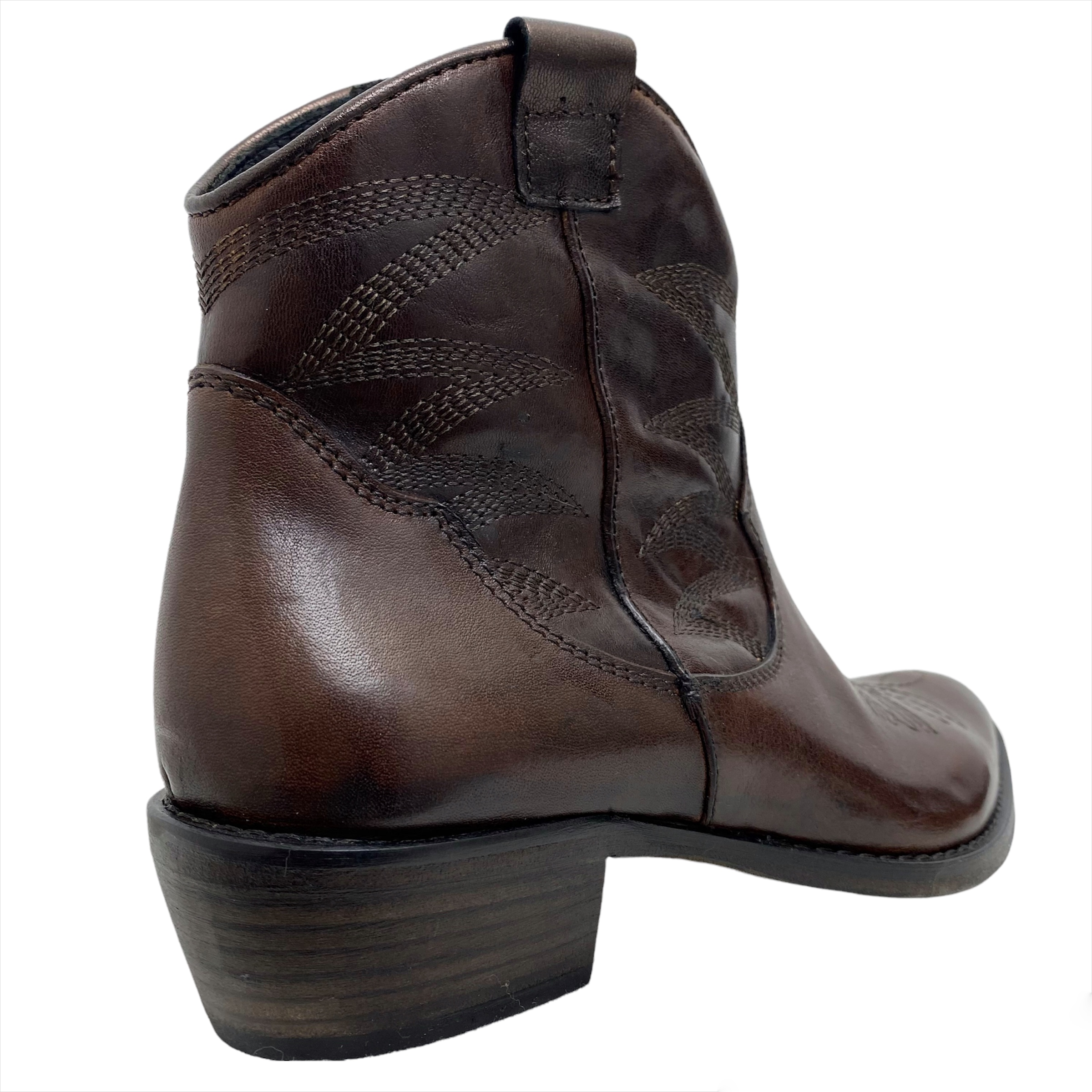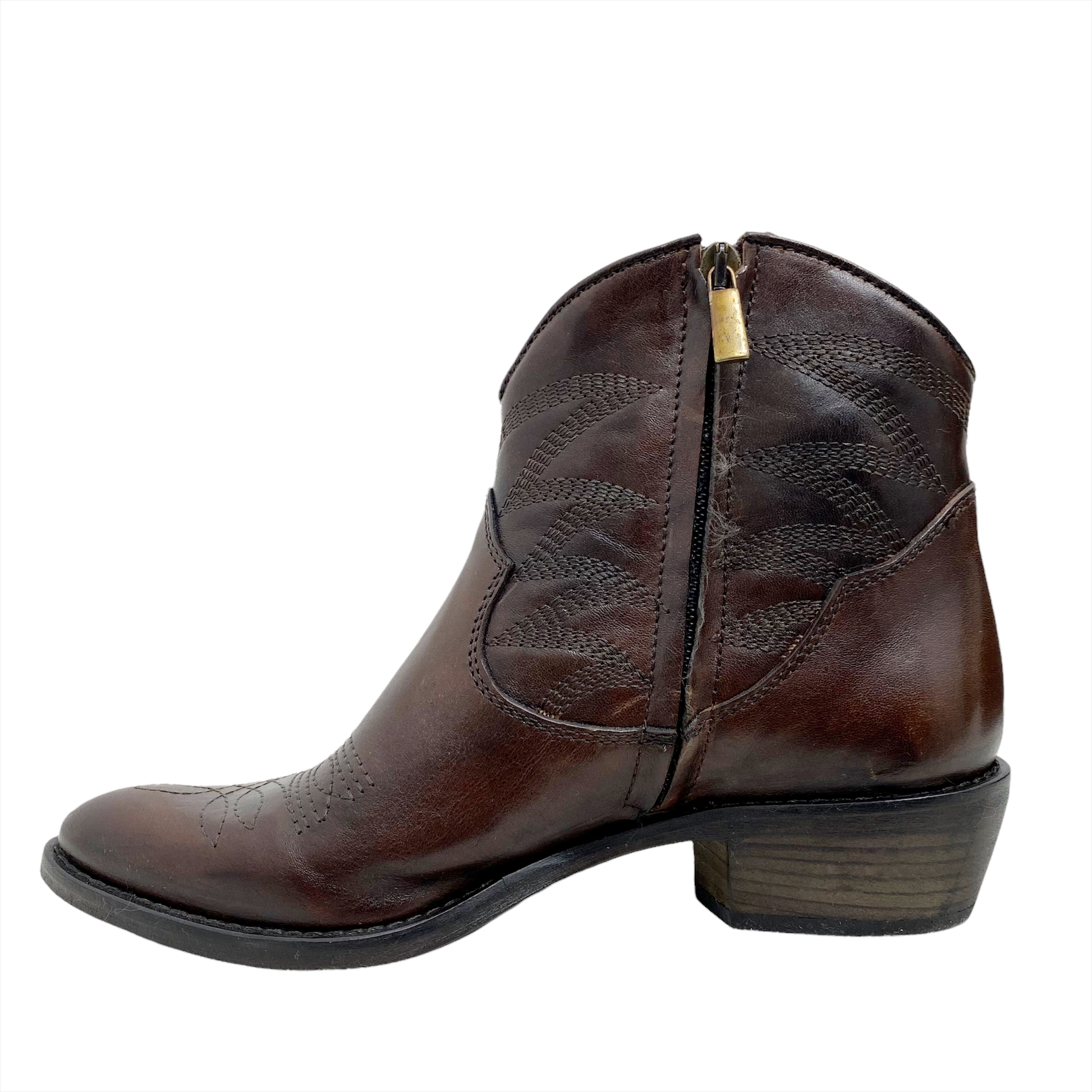 Gli stivaletti Le Guerresco sono un capo di tendenza che unisce lo stile camperos al design rivisitato, perfetto per chi cerca un capo unico e di classe. Questo stivaletto ĆØ realizzato in pelle castano di alta qualitĆ , con una bordatura superiore di colore testa di moro laminato e impunture della stessa tonalitĆ  per un look elegante e sofisticato.