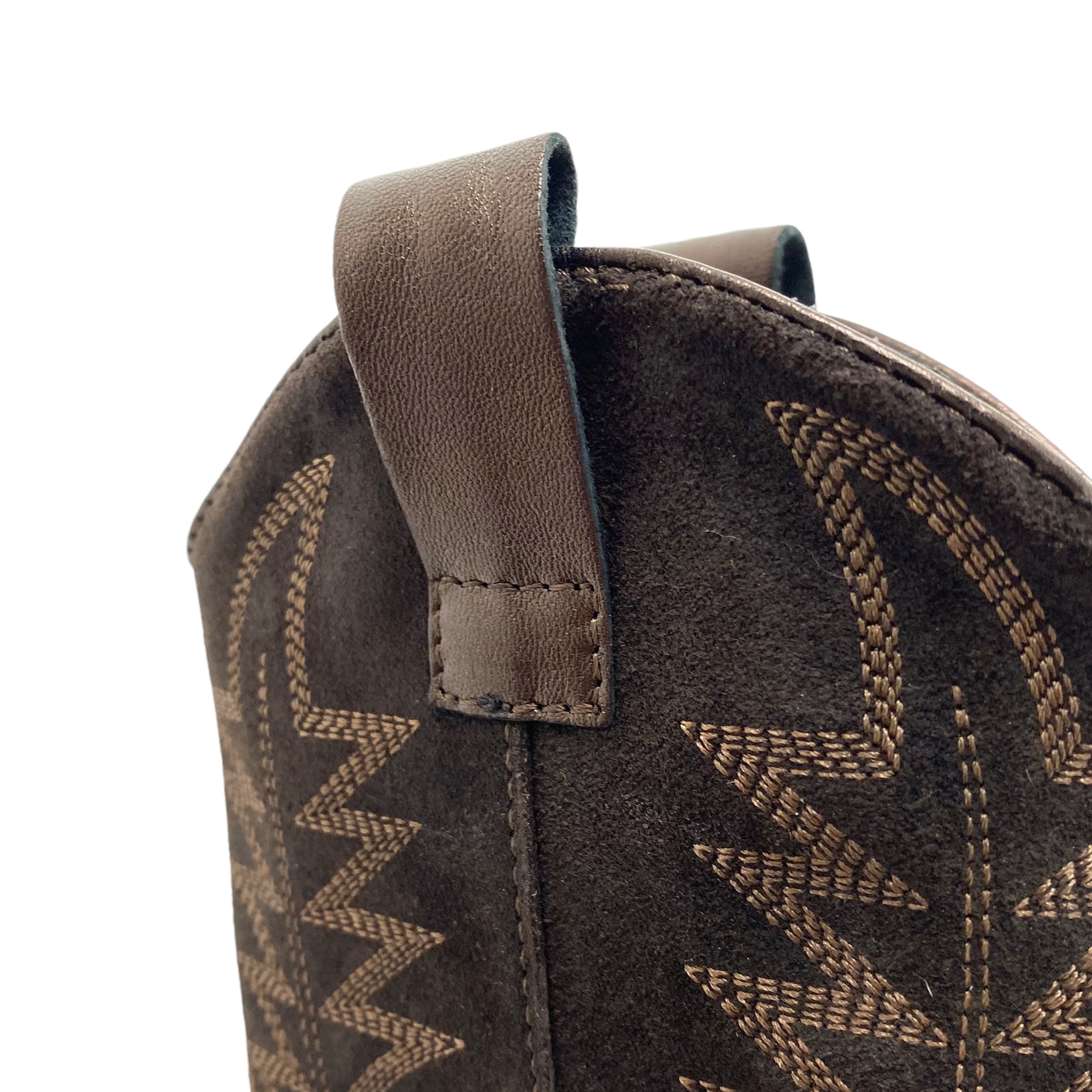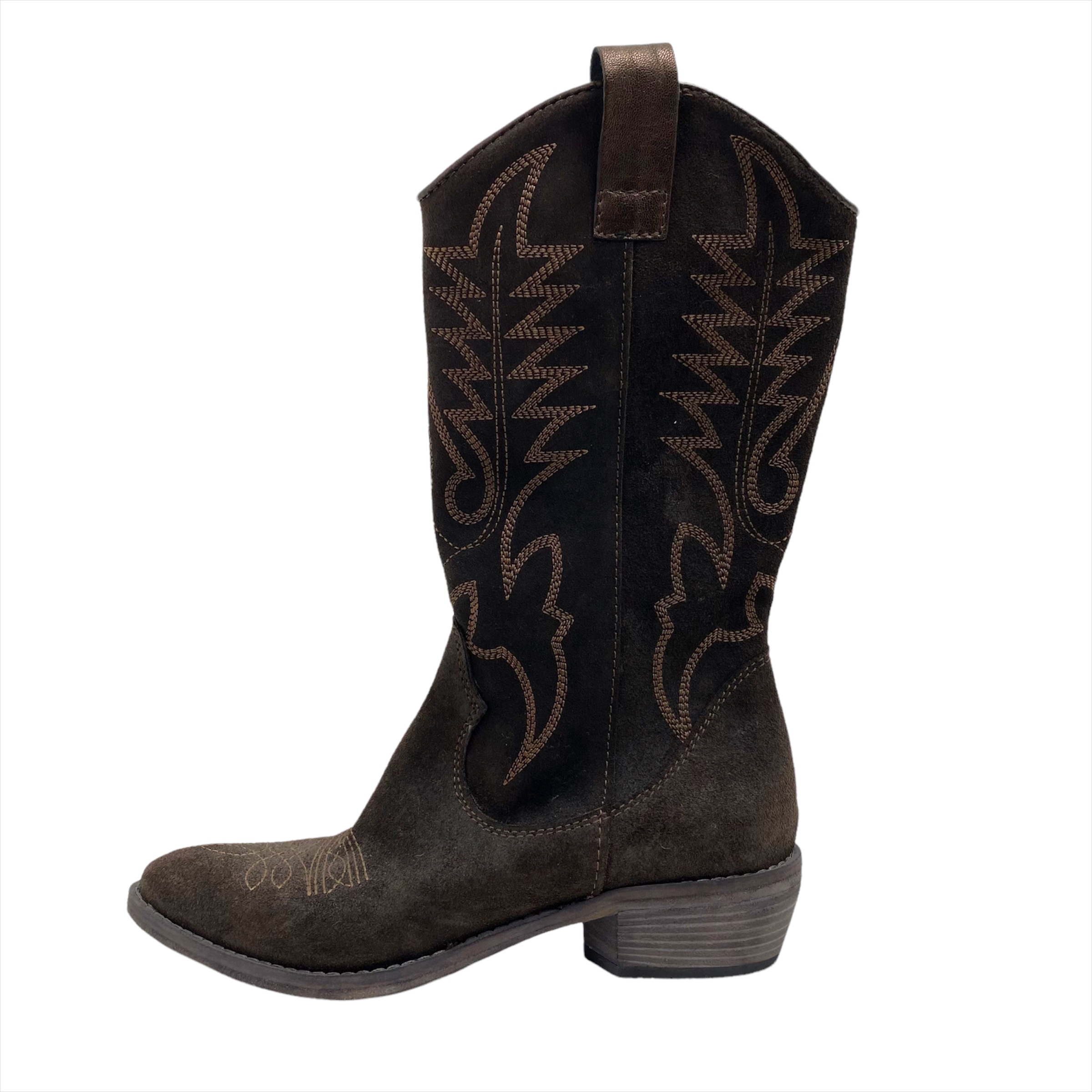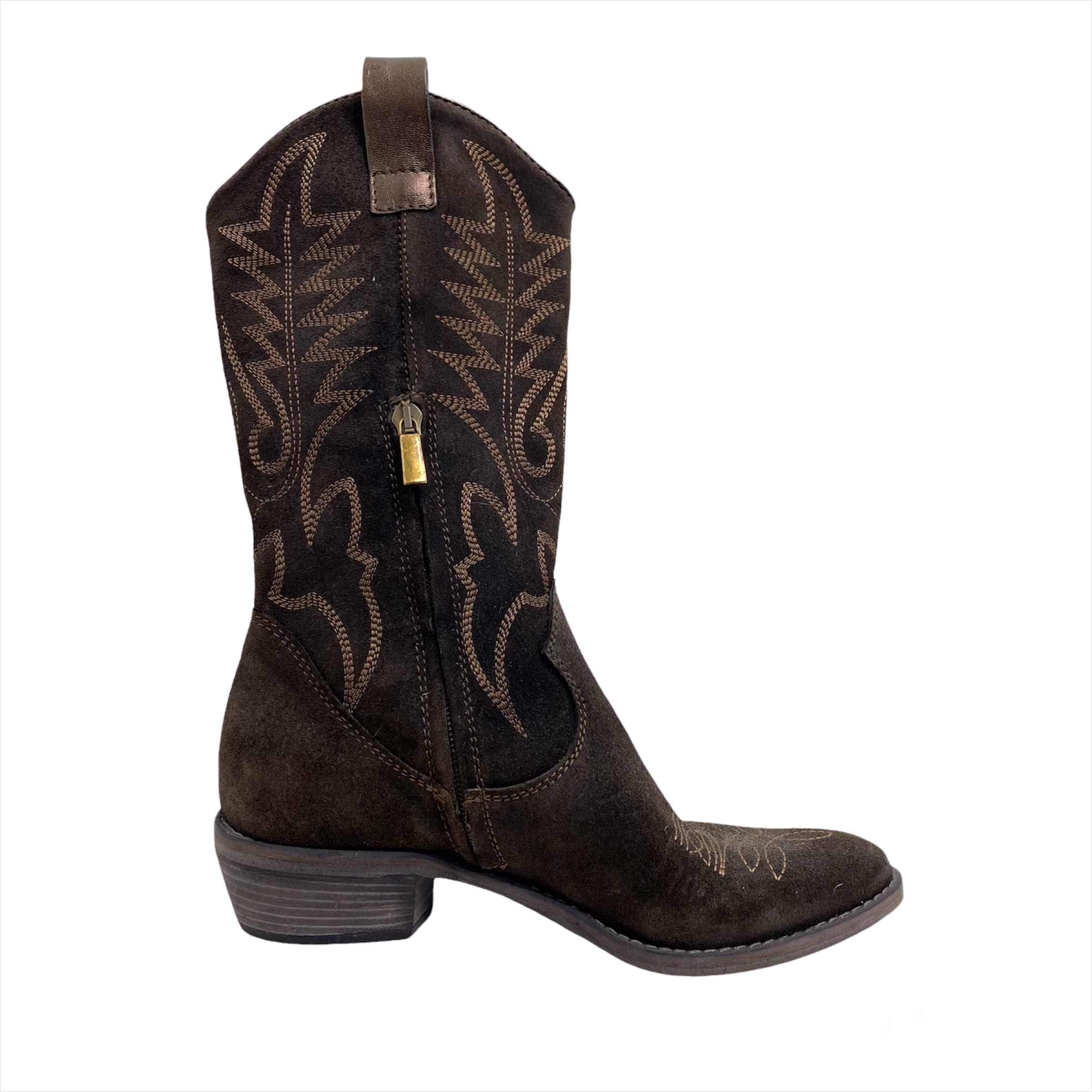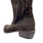 Rinnova il tuo guardaroba con gli stivali alti in camoscio di Le Guerresco! Questo camperos rivisitato in camoscio castano e ricamo in contrasto con bordo superiore laminato ĆØ un prodotto artigianale creato da noi e dotato di zip laterale e suola in gomma. L’altezza adatta alla gamba lo rende versatile e facile da abbinare con qualsiasi outfit, dai pantaloni stretti alle gonne o agli shorts. Con un tacco di 4 cm, questo stivale made in Italy donerĆ  un tocco di stile in più ai tuoi look invernali. Aggiungi subito questo must-have alla tua collezione di calzature!