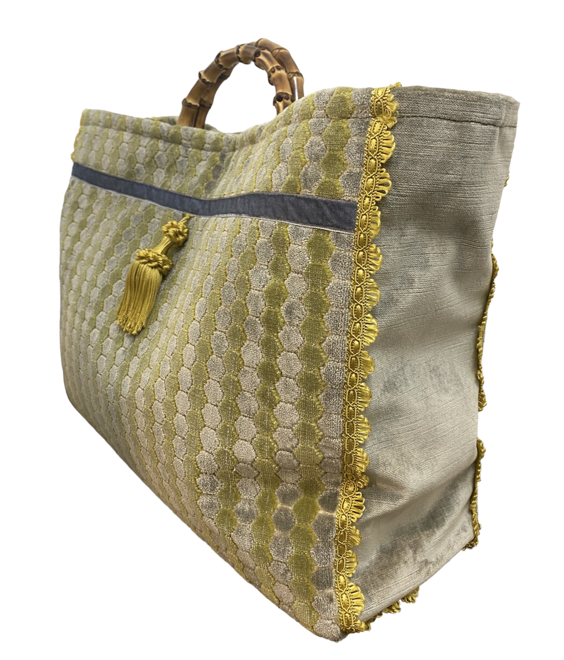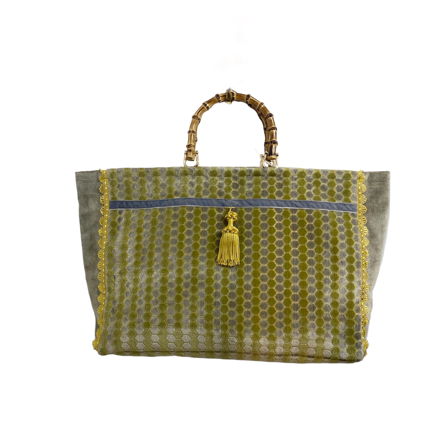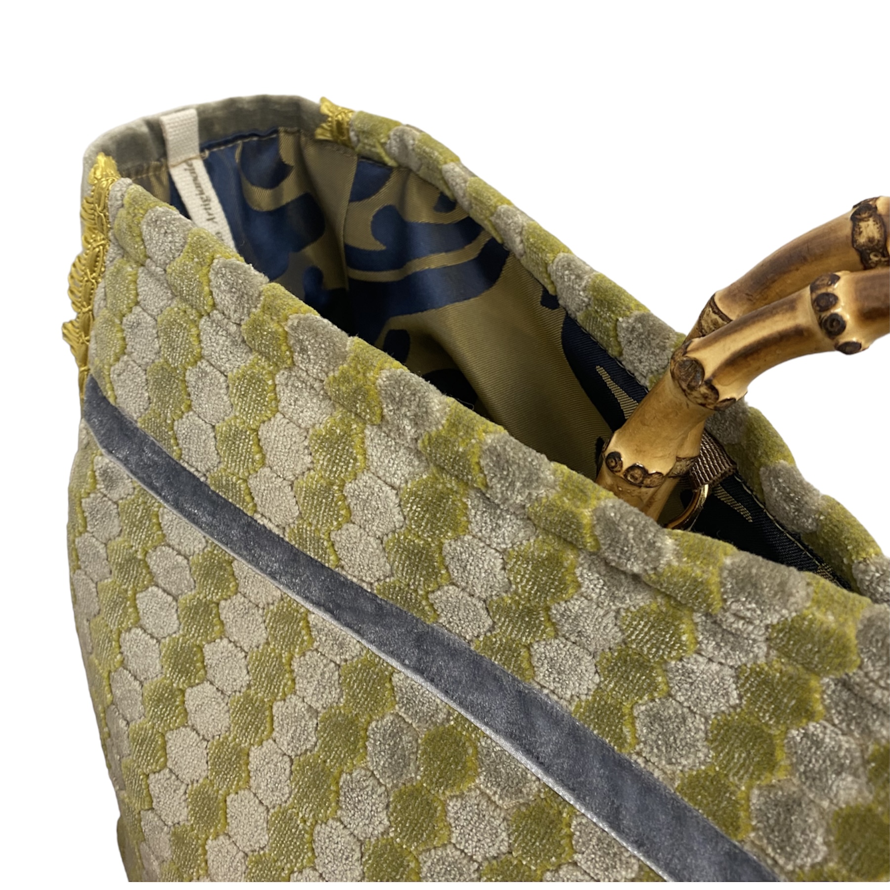 La borsa shopper Le Guerresco di VersoGiove ĆØ in velluto grigio con fantasia esagonale e sfondo verde