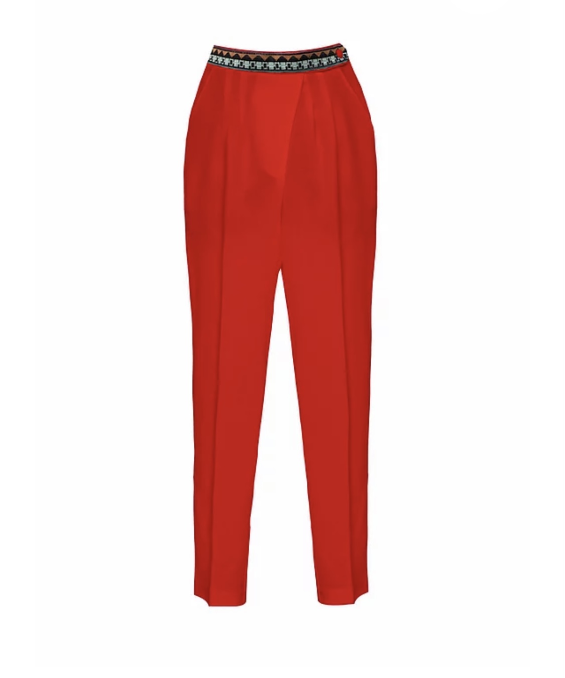 Pantalone di Mariaelena Samperi Maison rosso,Ā  adatto a qualsiasi occasione. L’essenza del modello carrot iper femminile si mescola con un taglio dal sapore sartoriale maschile.