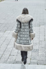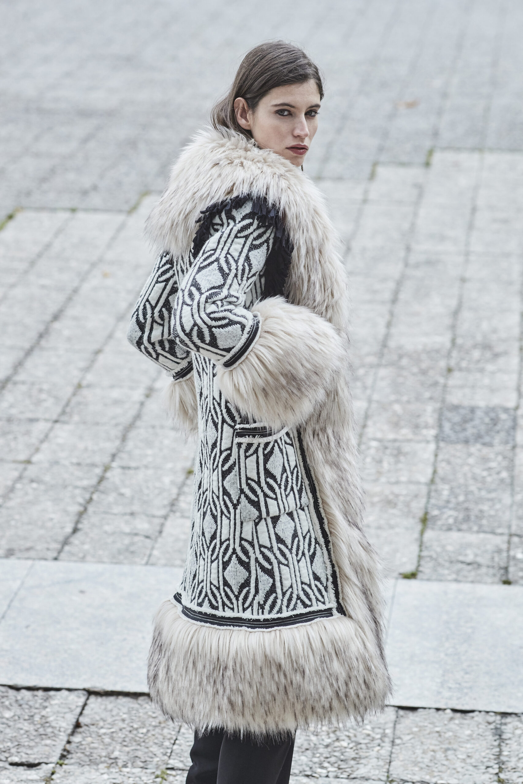 Il cappotto lungo di The Extreme Collection ĆØ un capospalla fatto di lana e baby alpaca, tutti tessuti di alta qualitĆ , con base bianco e nero ed ĆØ impreziosito da una bordatura in pelliccia sintetica color chiaro.