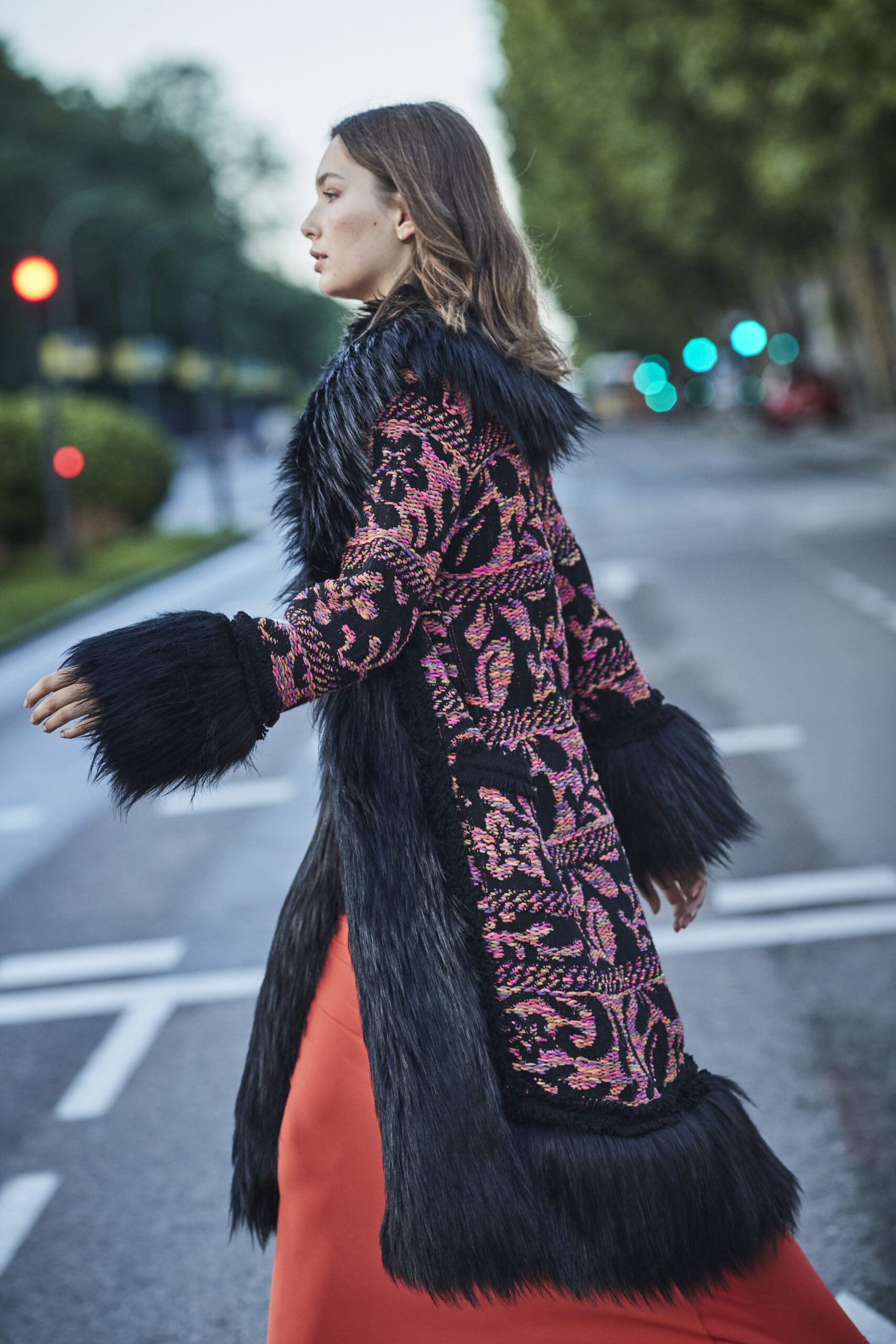 Anche i dettagli sui polsini sono in eco pelliccia anch’essa nera.