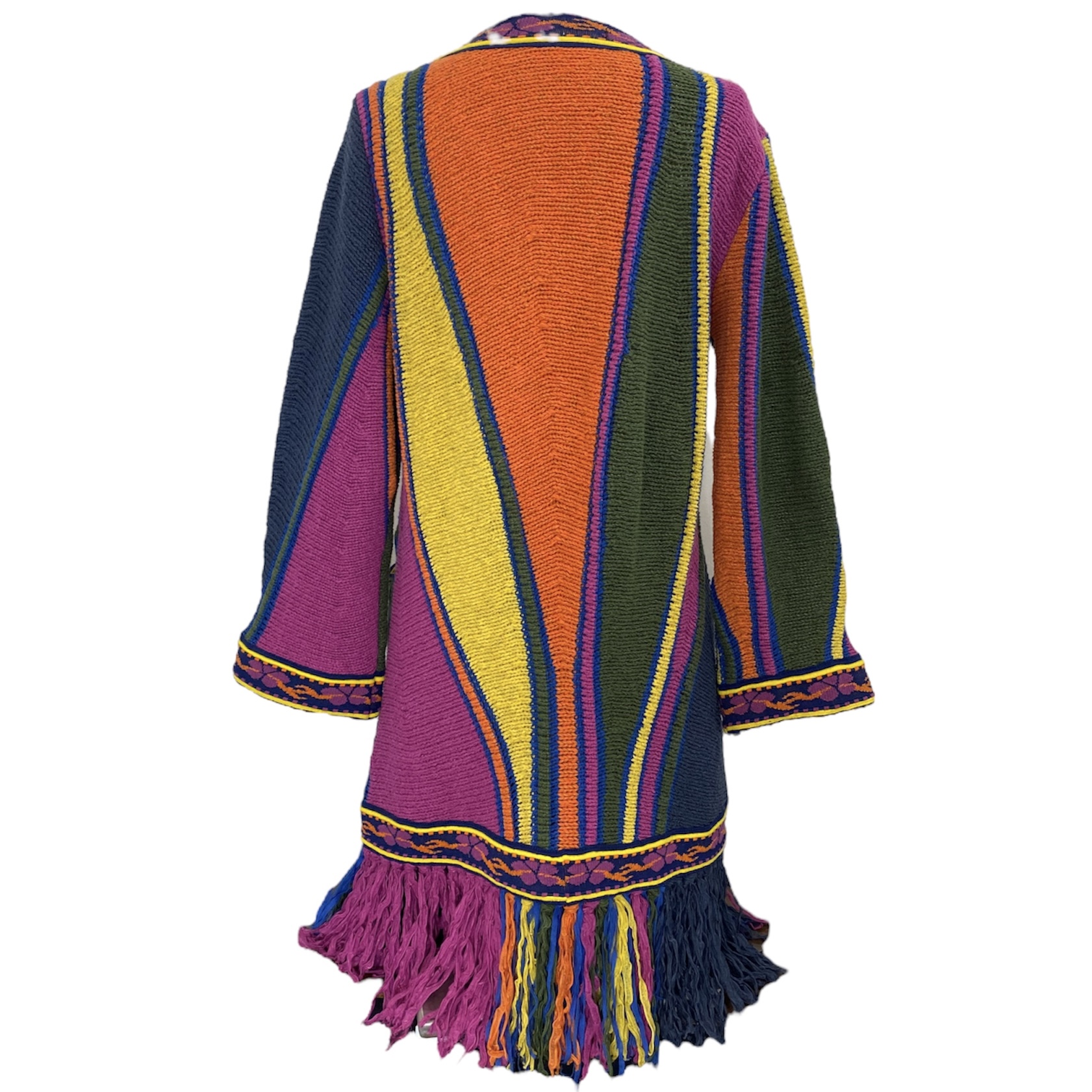 La manica lunga e la bordatura frangiata conferiscono al capo un tocco di eleganza e originalitĆ . Il cardigan dispone di due tasche laterali molto pratiche, mentre il gancio consente una facile chiusura del capo. Ha due nappine all’altezza del gancio di chiusura.