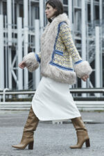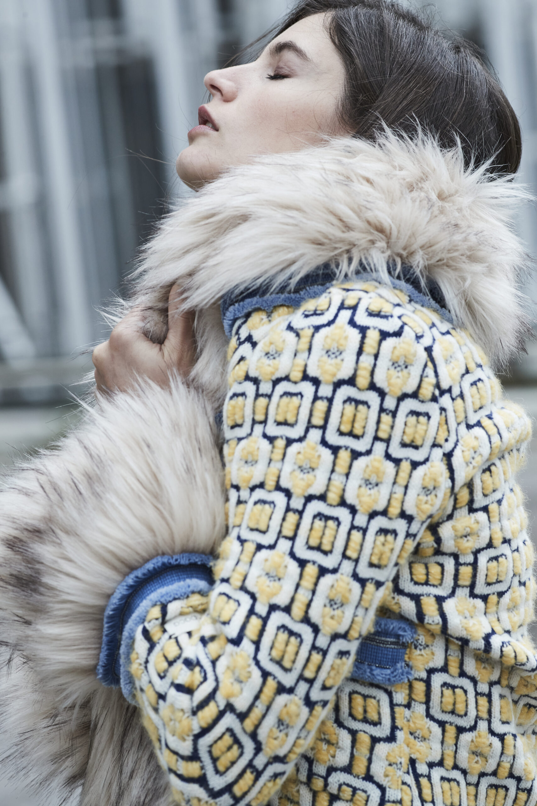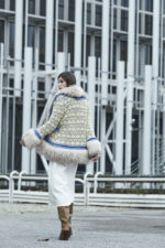 Anche i dettagli sui polsini sono in eco pelliccia anch’essa chiara e ha rifiniture in blu jeans.