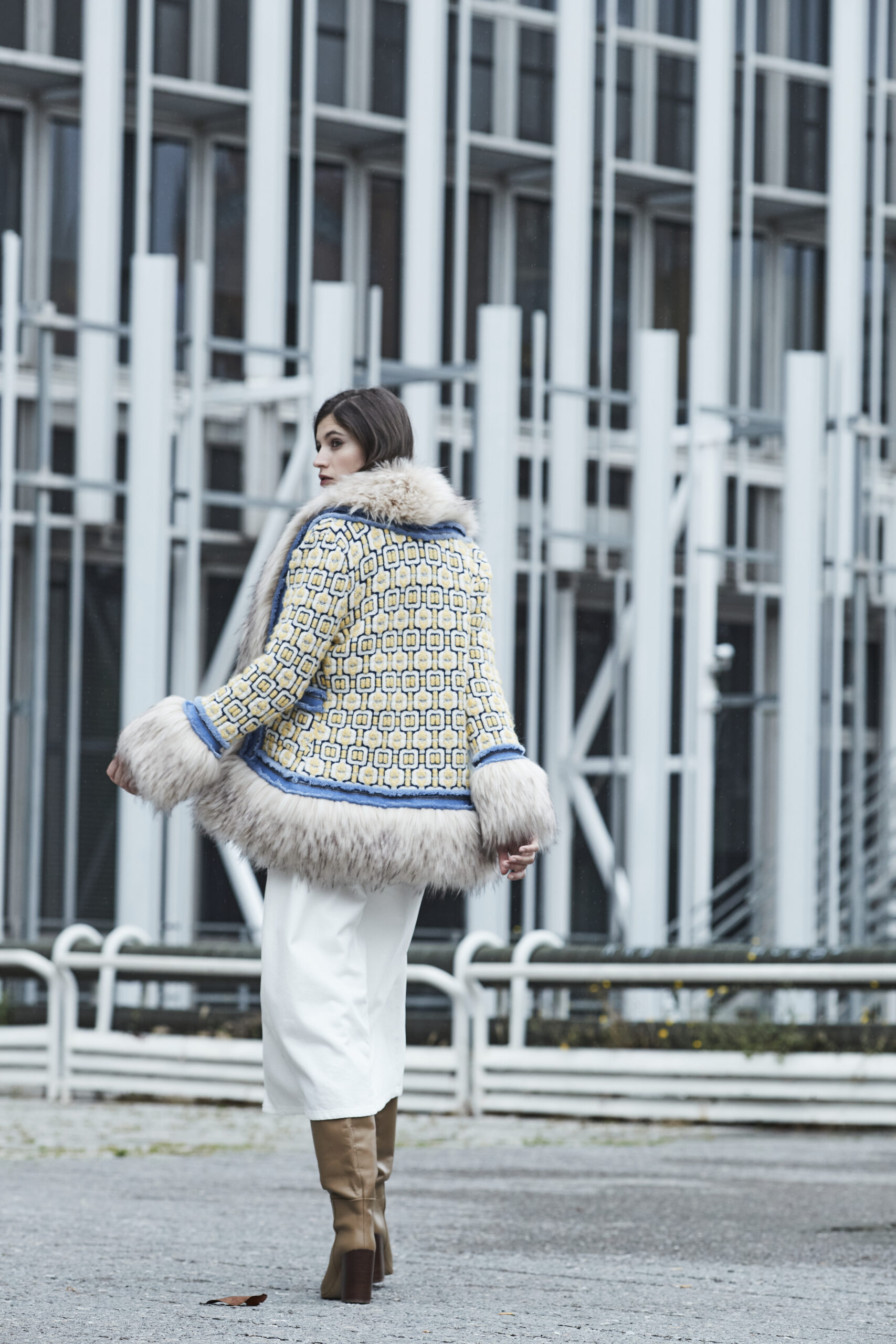 La giacca corta di The Extreme Collection ĆØ un capospalla fatto di lana e baby alpaca, tutti tessuti di alta qualitĆ , con base bianca e gialla ed ĆØ impreziosito da una bordatura in pelliccia sintetica color chiaro.