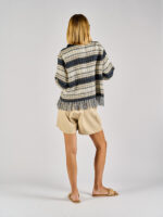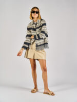 La giacca a righe di Violanti ĆØ realizzata in stuoia beige e blu, con dettagli in paillettes e frange per un tocco di eleganza unico. Il taglio camicia con colletto e le quattro tasche la rendono un capo versatile e perfetto per creare look casual chic. Ideale da indossare con jeans o pantaloni eleganti per un outfit glamour e di tendenza.