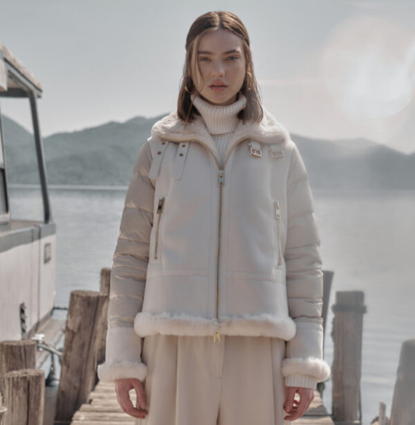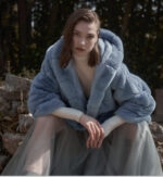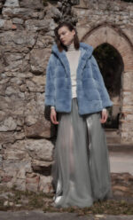Il giaccone di Violanti ĆØ fatto di pelliccia rat mousquĆØ color celeste.