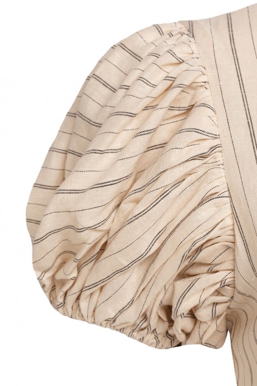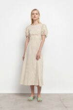 Il colore ecru rigato del vestito conferisce un’aria sofisticata e minimalista, perfetto per occasioni formali o informali. Le maniche corte a palloncino aggiungono un tocco di romanticismo e femminilitĆ , mentre l’apertura sul retro decorata con due lacci aggiunge un dettaglio chic e sensuale.
